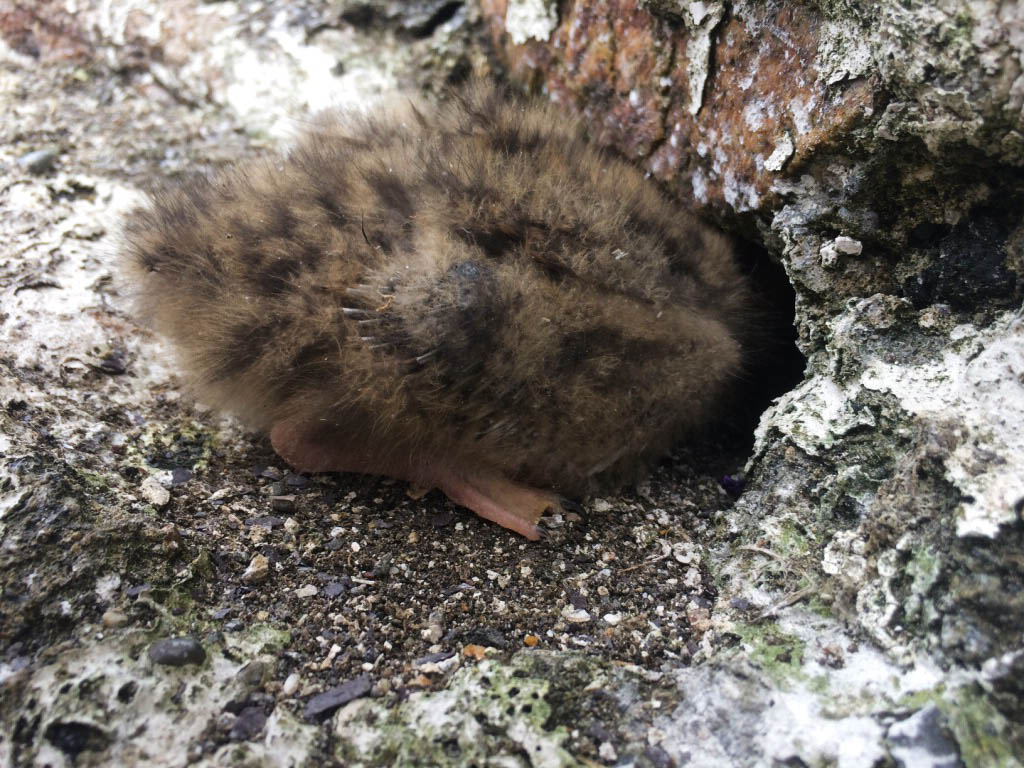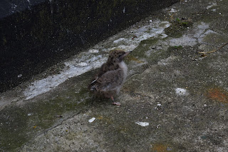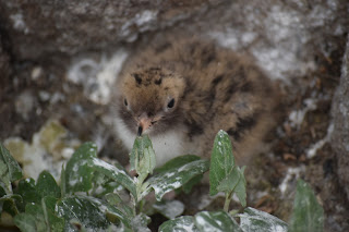 The fluff ball stage lasts for about a week and then they begin transitioning to growing pins. This common tern chick is around 7 days old at this point has started growing their pins, the narrow tube like structures from which their very first set of feathers will emerge from. At this stage they have become quite mobile and start venturing all over the place away from their original nest site to any decent shelter or hiding place. Though venturing around the place comes with its own dangers as they can be pecked by other adults who are usually none too pleased to see these curious chicks that aren't theirs roaming around their nests and chicks.